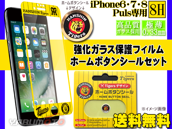 タイガース デザイン 強化ガラス 保護フィルム YELLOW ホームボタンシール Aタイプ 虎 セット iPhone6 7 8 Plus メール便 送料無料