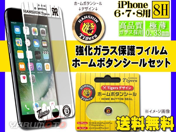 タイガースデザイン 強化ガラス保護フィルム WHITE ホームボタンシール Aタイプ 虎 セット iPhone6 iPhone7 iPhone8 メール便 送料無料