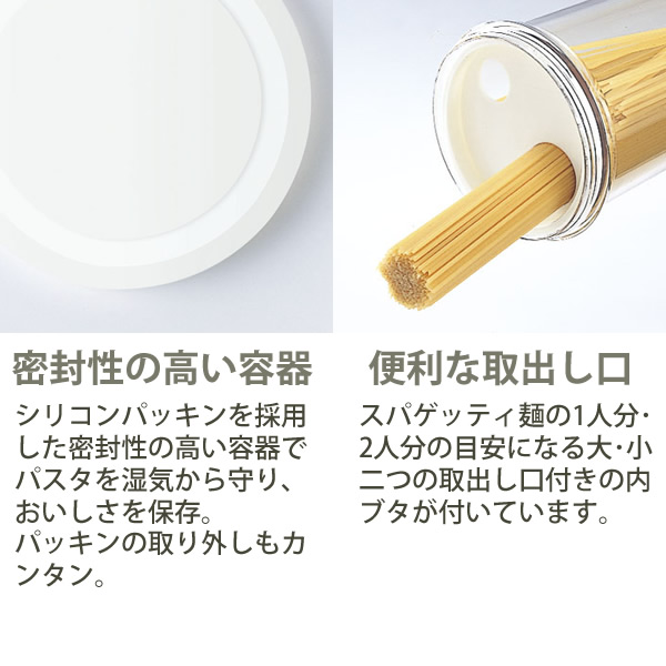 パスタを湿気からしっかりガードして保存できる、密閉パスタ保存ケース。1kgのスパゲッティがストックできる1.5Lの大容量サイズです。