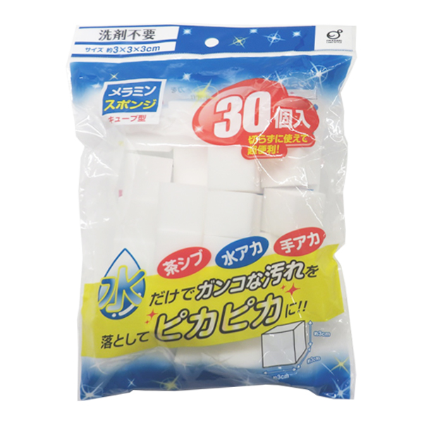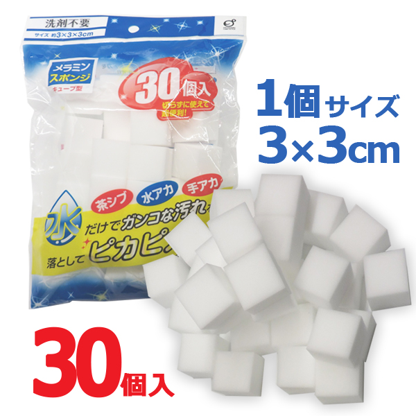 水だけで汚れを落とすメラミンスポンジキューブ型30個入りです。