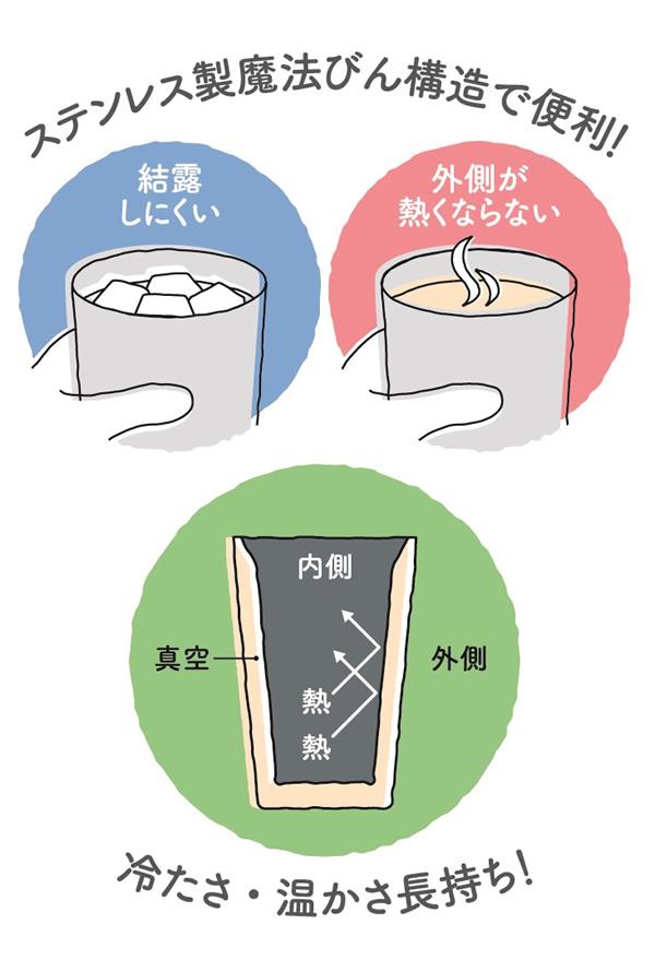 ステンレス魔法びんと同じ真空断熱構造だから、保温・保冷力バツグンのタンブラーです。