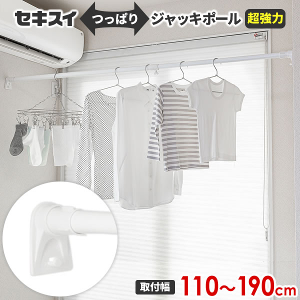 つっぱり棒 突っ張り棒 室内物干し竿 伸縮ポール 超強力 セキスイ 積水 幅110〜 幅190 奥行5.5 高さ8 センチ cm 強力ジャッキ フック付き クローゼット 押入れ 衣類ハンガー 吊り下げ ネジ釘不要 伸縮自在 簡単取り付け ポール 部屋干し 室内干し カーテン カーテンレール 暖簾 収納 洗濯用品 洗濯グッズ ランドリー用品 ランドリーグッズ 収納用品 トイレ 納戸 洗面所 おすすめ オススメ 人気 便利 便利グッズ すっきり スッキリ 片付く 省スペース コンパクト リビング 寝室 ウォークインクローゼット WIC コートハンガー 目隠し 4906648098781