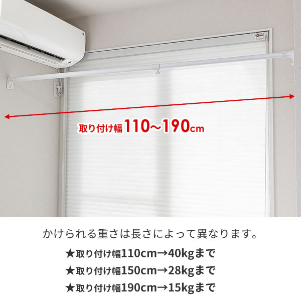 かけられる重さ:取り付け幅110cm/40kgまで 取り付け幅150cm/28kgまで 取り付け幅190cm/15kgまで