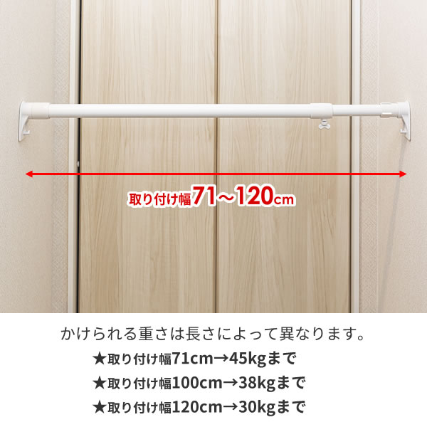 かけられる重さ:取り付け幅71cm/45kgまで 取り付け幅100cm/38kgまで 取り付け幅120cm/30kgまで