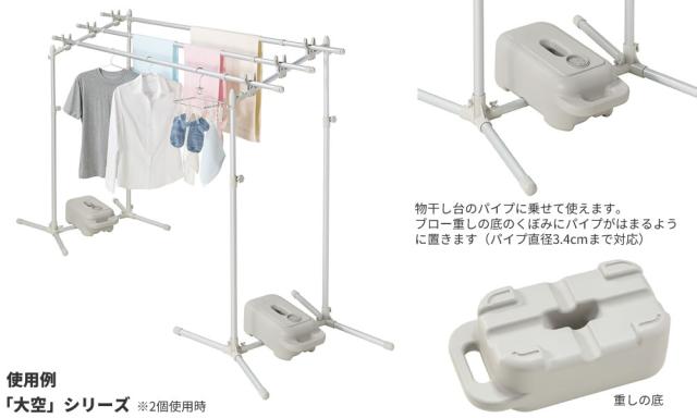 洗濯物が乾いてくると物干し全体が軽くなるため物干し台が倒れやすくなります。重りを置いて物干しの転倒防止!