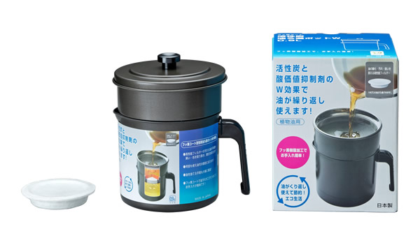 活性炭と酸価値抑制剤のダブル効果で油がくり返し使える油ろ過ポット。