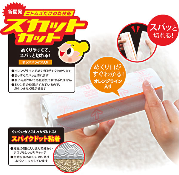 テープはスパイクドット粘着加工。 カーペットの毛足の奥までぐいぐい食い込み、髪の毛・ホコリ・ダニなどの細かいゴミをしっかり取り除きます。