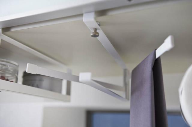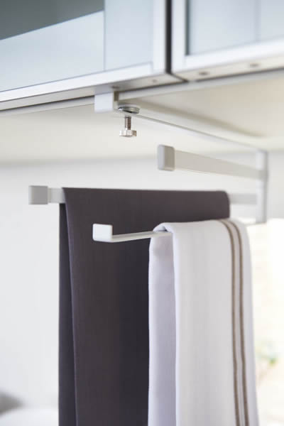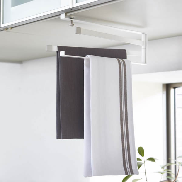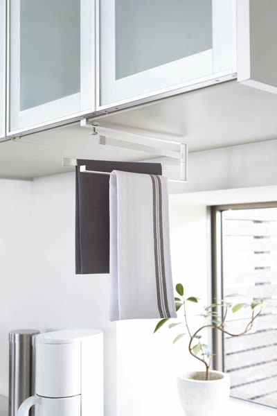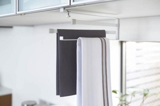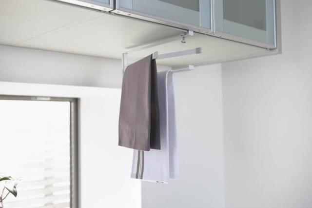 キッチンの吊り戸棚に差し込んで使用するふきんハンガー。