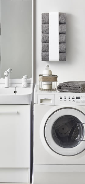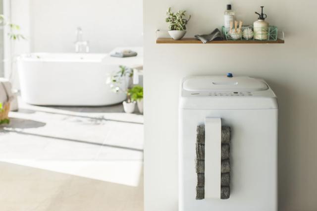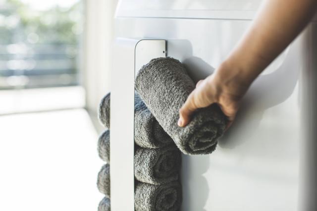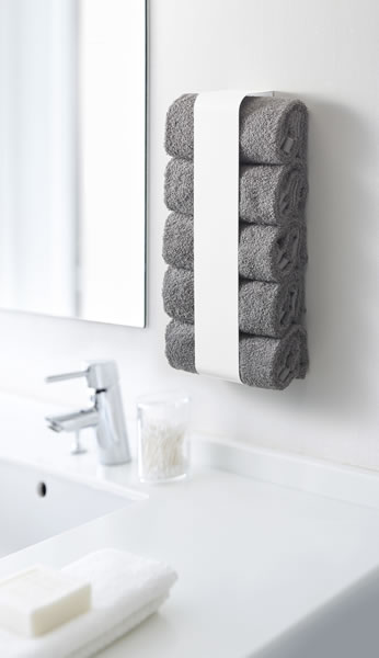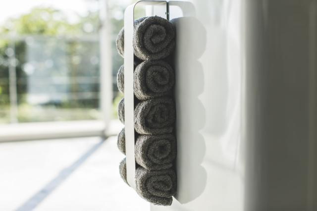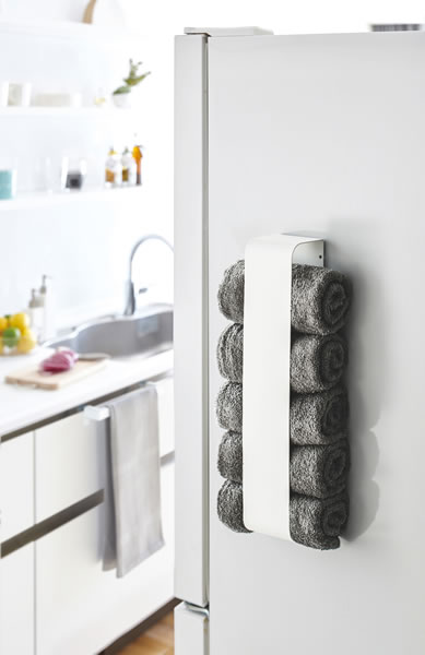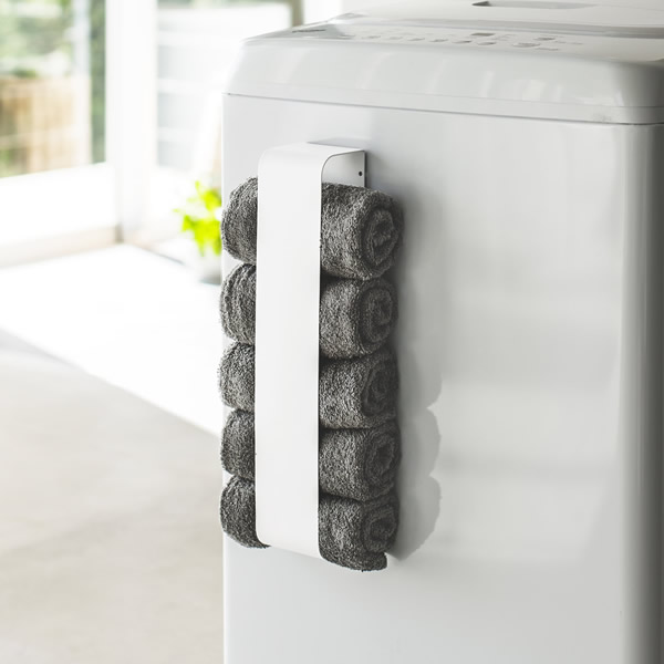 タオルを丸めて挟むだけで、洗濯機や冷蔵庫の側面などにタオル収納ができる。