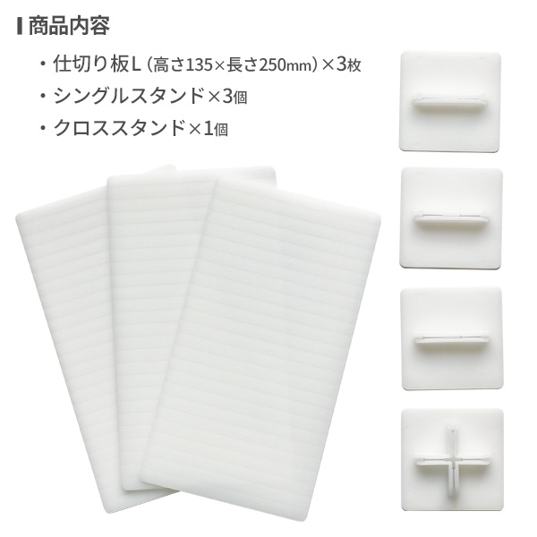 セット内容:仕切り板(高さ135×長さ250mm)×3枚/シングルスタンド3個/.クロススタンド1個