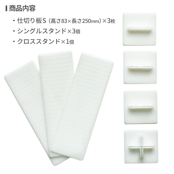セット内容:仕切り板(高さ83×長さ250mm)×3枚/シングルスタンド3個/.クロススタンド1個