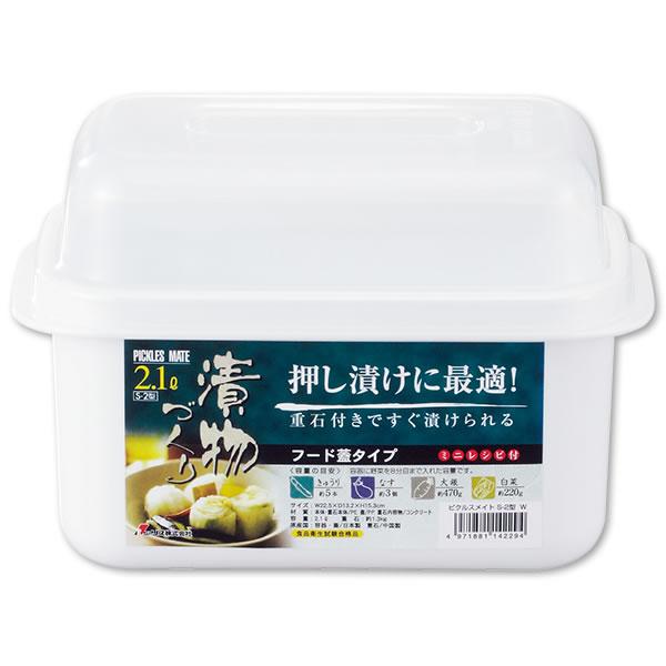 漬物容器 ピクルスメイト 角型 重石付き 2.1L ホワイト S-2型 | 即席漬物器 浅漬け ピクルス 重し付き 押し漬け 重石つき フード蓋つき きゅうり なす 大根 かぶ 白菜 日本製