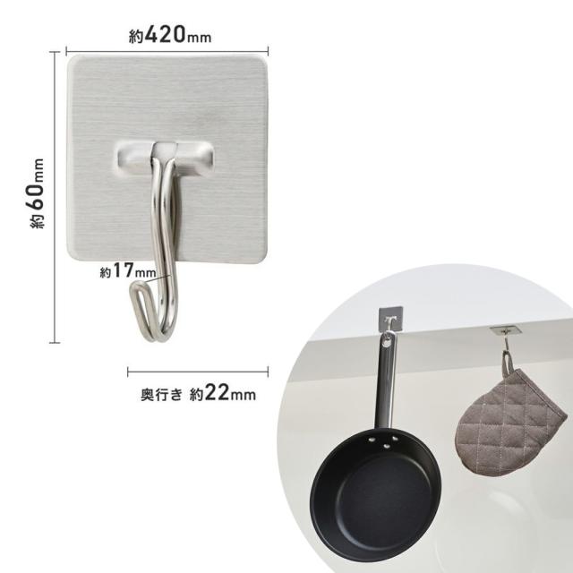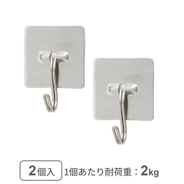 粘着テープで取り付け簡単、ステンレス製フック(2個入)。