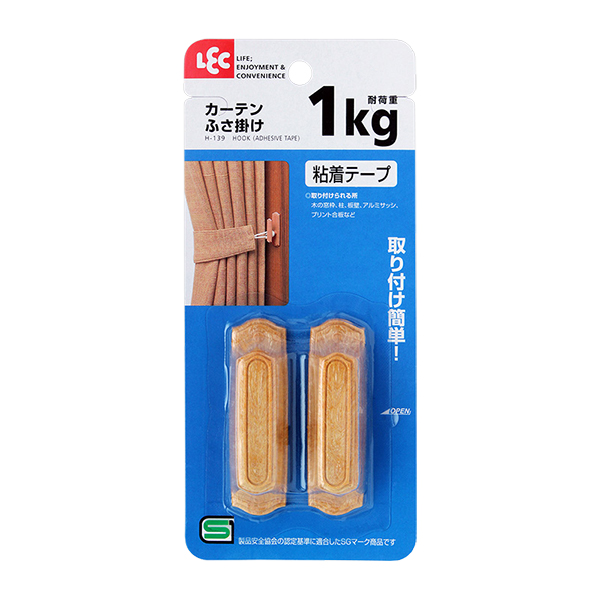 カーテンホルダー タッセルフック カーテン止め ふさ掛けLEC DIY 両面テープ 粘着テープ 房掛け カーテン用 後付け ブラウン 柱 窓枠 木目調 シンプル H139 フック curtain hook 4903320253971