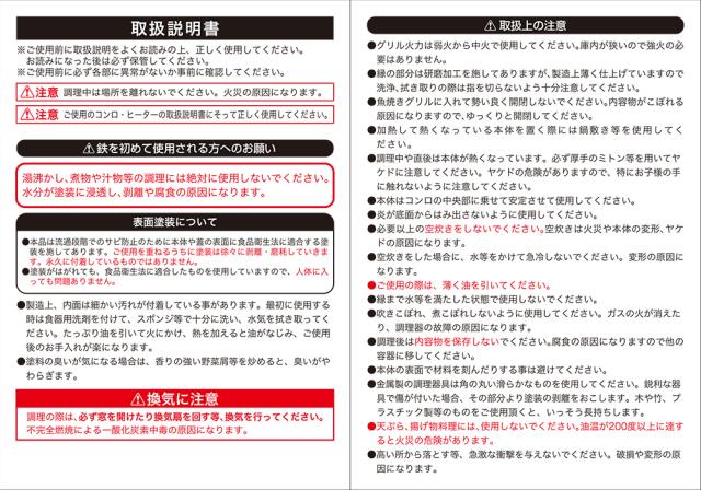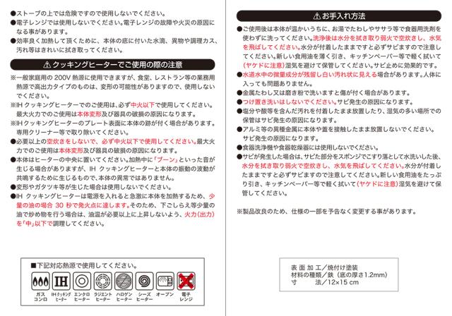 ご注意本製品は鉄製です。焦げ付き防止のため、調理前には薄く油をひいて下さい。