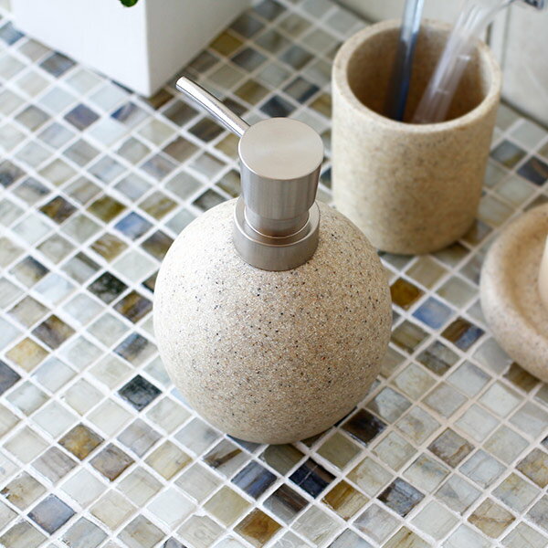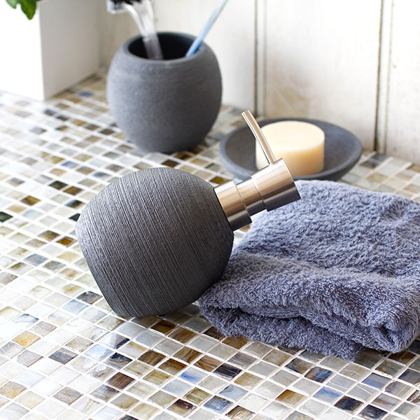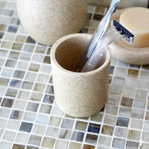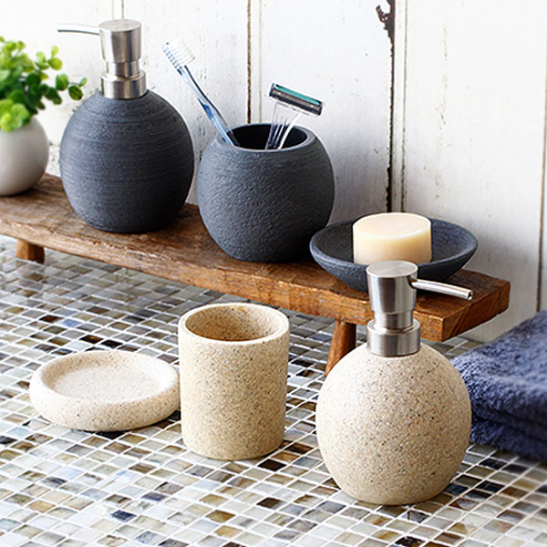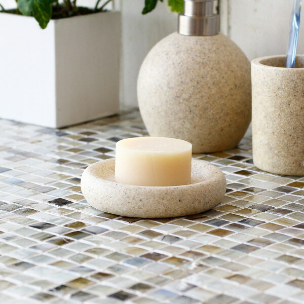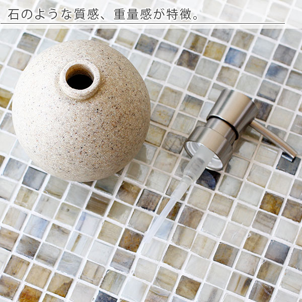 ポリレジンという素材でできており、樹脂では出せない重量感や質感があり、さらに陶器と比べて割れにくく耐久性のある素材ですので、滑りやすい洗面所でも安心してお使いいただくことができます。