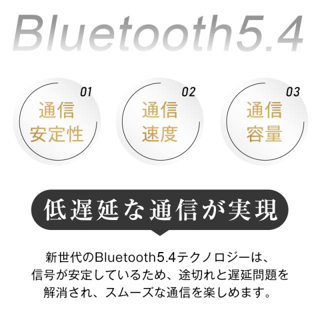 イヤホンはBluetooth 5.4テクノロジーにより最大33ft(10m)の通信距離に達ち、無障碍作動!急速接続!安定伝送出来ます!知能チップ内蔵で2台のデバイスとペアリング出来ます!電話や音楽再生など自由に切替出来ます!