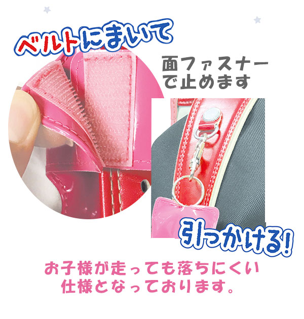 | 使用方法 | [取り付け方法] 1.カバーの中からリングを引き出し、カギを取り付けてください。カギは最大約縦70×横55mmまで取り付け可能です。 2.フックにひっかけて、ベルトに巻き付け、面ファスナーで止めます。お子様が走っても落ちにくい仕様となっています。 |