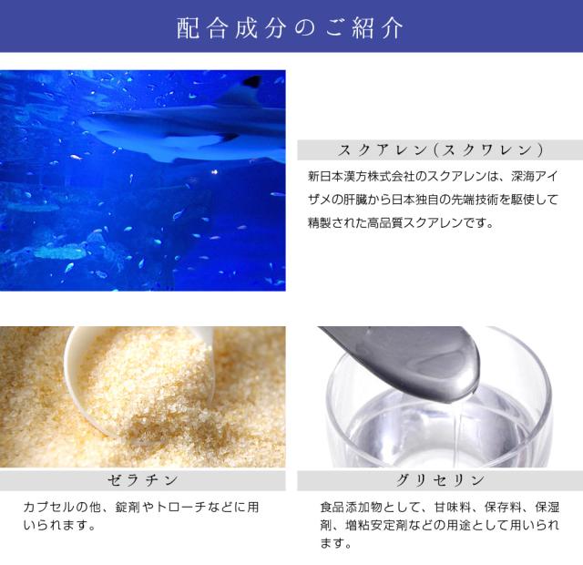 ●商品説明: スクワレン99.99%から作ったソフトカプセルの製品です。日本の先進技術により抽出した原料を基に優れた製法で丁寧に仕上げた商品です。従来のスクワレン製品に比べ、独特の魚臭さがないのが特徴です。