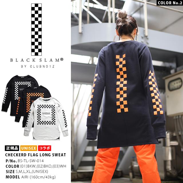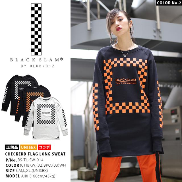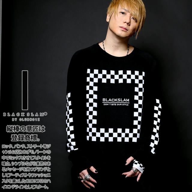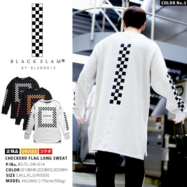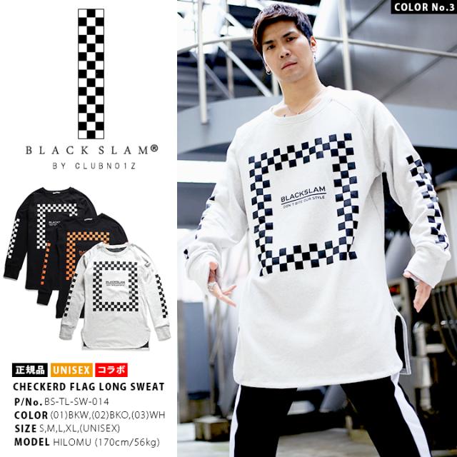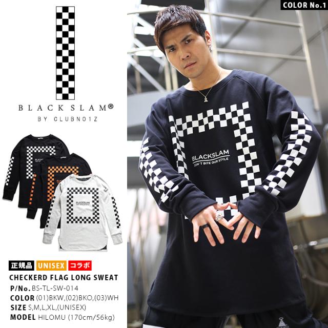 BLACK SLAM トレーナー 長袖 裏起毛 メンズ レディース 黒 白 ブラック ホワイト クラブノイズ スウェット おしゃれ シンプル ロング丈 ライン 袖ロゴ チェッカーフラッグ 柄 b系 ヒップホップ ファッション ダンス ストリート系 服 BS-TL-SW-014