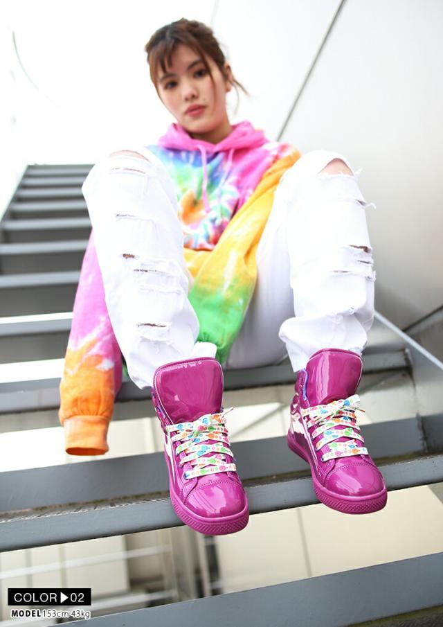 本商品はキックス愛好家の為のシューレース・コレクション。スイーツのキャンディーやアニメタッチのハートなどアメリカンポップを象徴するモチーフの総柄デザイン。靴をカラフルに飾るキュートな仕上がり。足元からコーディネート全体を格上げします。