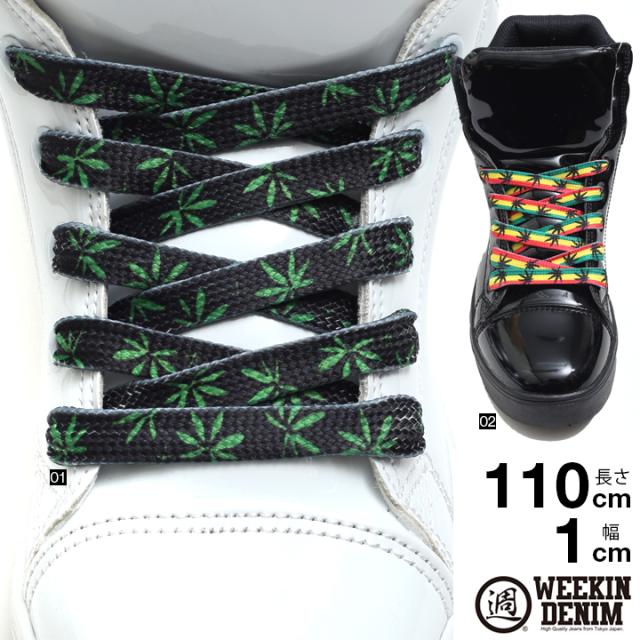 靴紐 おしゃれ ウィーキンデニム WEEKIN DENIM シューレース 平紐 魔法の靴ひも くつひも b系 ヒップホップ ストリート系 かっこいいマリファナ ヘンプ ラスタカラー 総柄 110cm WD-FW-KH-021