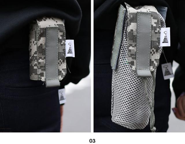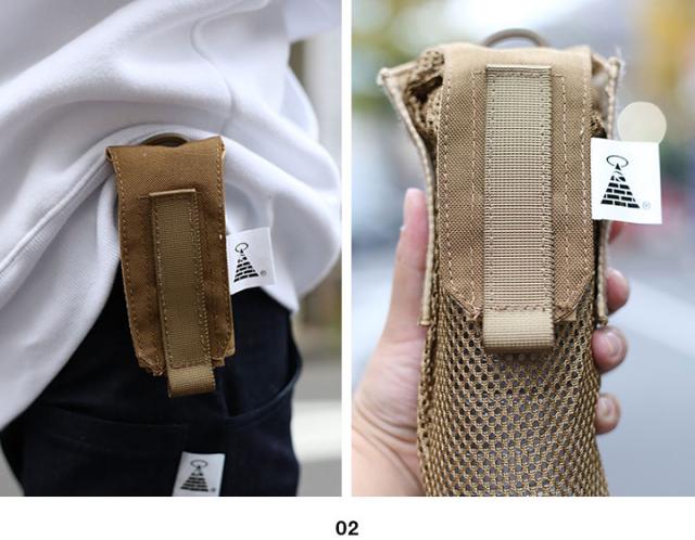 素材は重量感あるナイロン100%のナイロンキャンバス生地。内側のドリンクホルダーは生地厚めのメッシュ素材。シンプルでスタイルを選ばないどんな着こなしにも対応した折りたたみ可能な水筒&ペットボトルケース。マジックテープを開くだけで簡単にドリンク入れや、マルチケースとして使用できます。メッシュ袋の開封口にはドローコード付き。又、本体後ろ側の仕様はMOLLE(モール)システムにも対応。