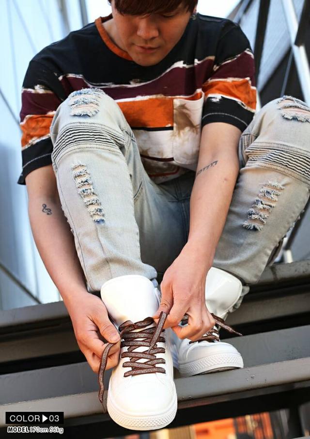 靴ヒモ素材は裏表なく使える編み込み素材。スニーカーファッションを代表する定番スタイル。形はホールド感やフィット感に優れた平紐タイプ。シューレースホール(ハトメ/アイレット)を押さえつける接触面が大きいので、緩みの幅が少なく結び目がほどけにくいのも魅力のひとつ。