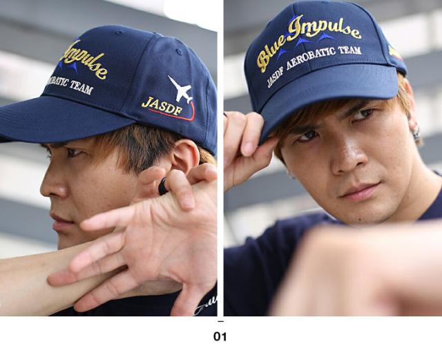 正面に6機編成のブルーインパルスの機体と筆記体の金のロゴマーク、サイドにJASDFロゴ刺繍入り。