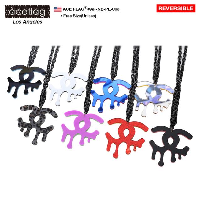 チェーンデザインはCカンをつないだ定番のアズキチェーン。ペンダントヘッドはインパクト抜群のドロドロペイントデザイン。表裏の色が異なるリバーシブルカラー。K-POP・B系・ストリート系スタイルには欠かせないブリンブリンスタイル。重ね付けでカッコよさも倍増。周りに差をつけるかっこいい1品。