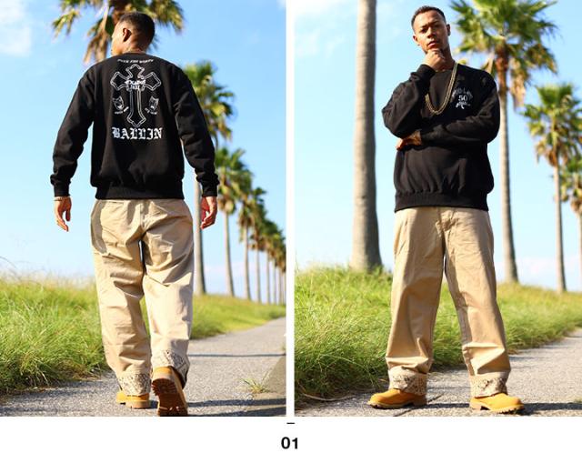 着用感は腰や太もも回りから膝にかけてゆとりを持たせ、下半身にダボっとしたシルエットを作るバギーフィット。サイズアップすれば写真のような腰履きにも対応。正にB系・ストリート系の超王道スタイル。