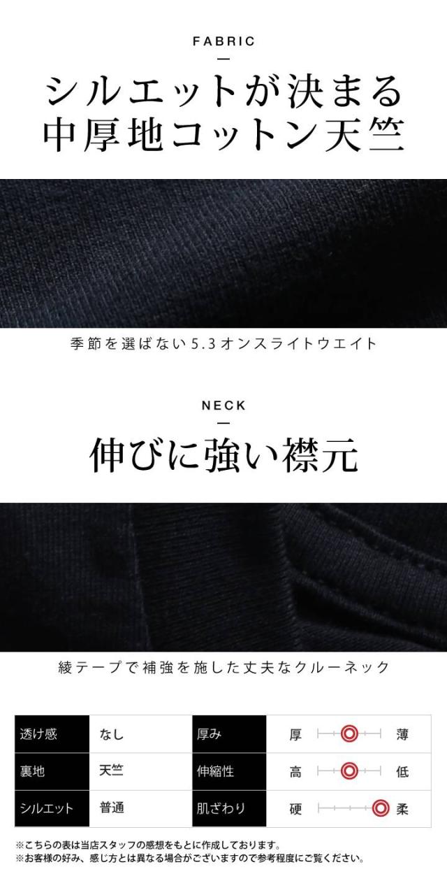 胴回りにほどよいフィット感があり、1枚でもシルエットがビシッとキマる、しなやかな肌触りと堅牢度に優れたコットン中厚地。