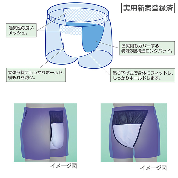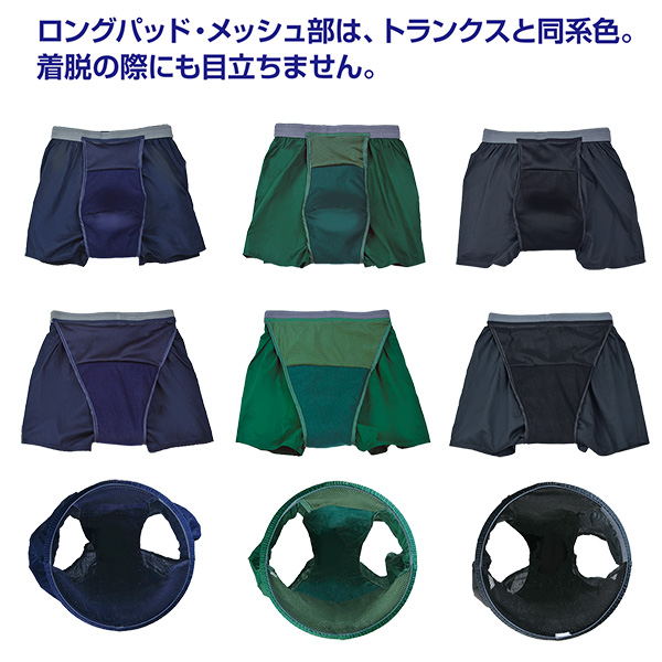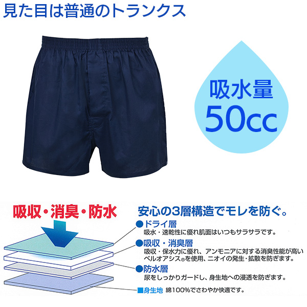 見た目は普通のトランクスですが、吸収・消臭・防水の3層構造ロングパッドが尿を素早く吸収し(吸水量目安:50cc)臭いの発生・拡散を防ぎます。