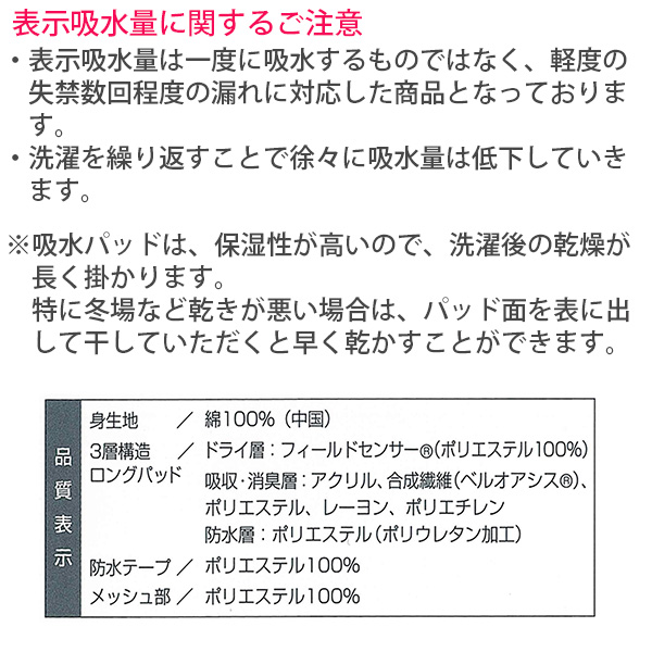 3層構造ロングパッド素材:ドライ層=フィールドセンサー(R)(ポリエステル100%)、吸収/消臭層=アクリル・合成繊維(ベルオアシス(R))・ポリエステル・レーヨン・ポリエチレン