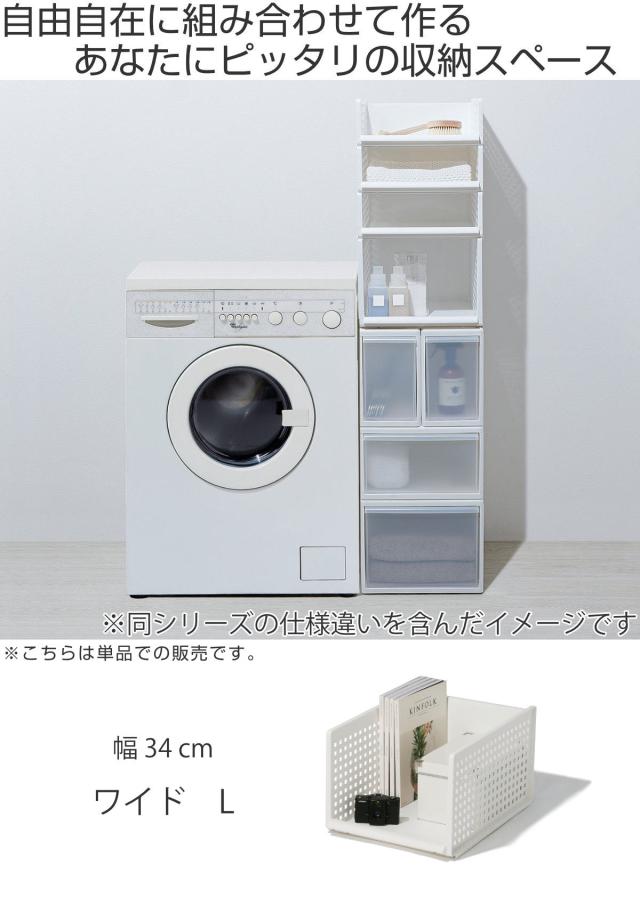 幅が同じ引き出しや、バスケットともスタッキングができるので、省スペースで大容量の収納が可能です。