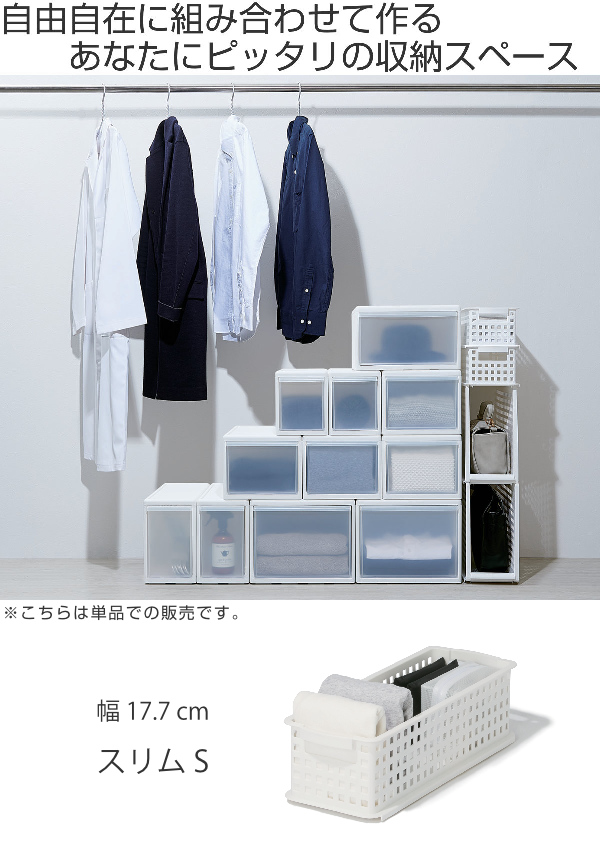 同じ幅タイプで積み重ねが出来ます。引出しやトレー、バスケットなど目的によって使い分けられる豊富なアイテムを揃えています。