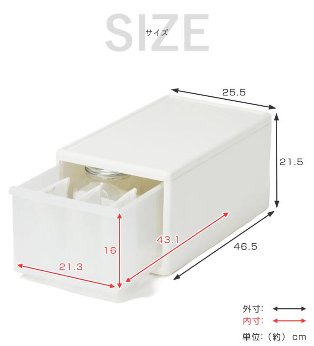 | サイズ | 約 幅25.5×奥行46.5×高さ21.5(cm) 引き出し内寸:約 幅21.3×奥行43.1×高さ16(cm) |
