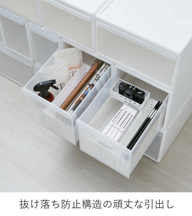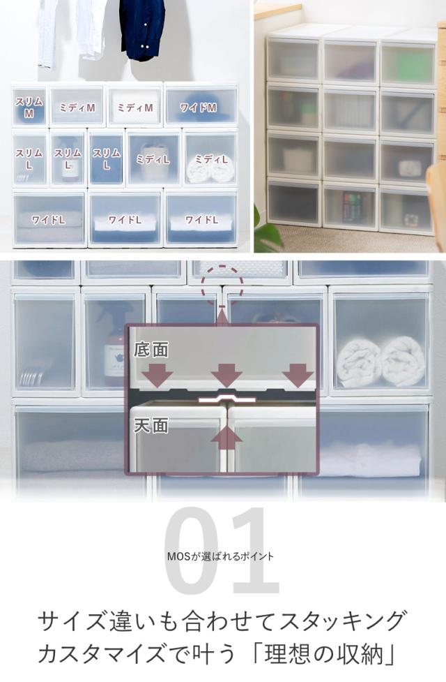 3種類の幅の異なる収納ケースでも積み重ねができるスタッキング構造で、自由にカスタマイズができます。無駄な空間を作らないブロック式構造なので、スッキリとした見た目です。MOSの収納ケースなら、スペースを有効活用したあなただけの「理想の収納」が作れます。