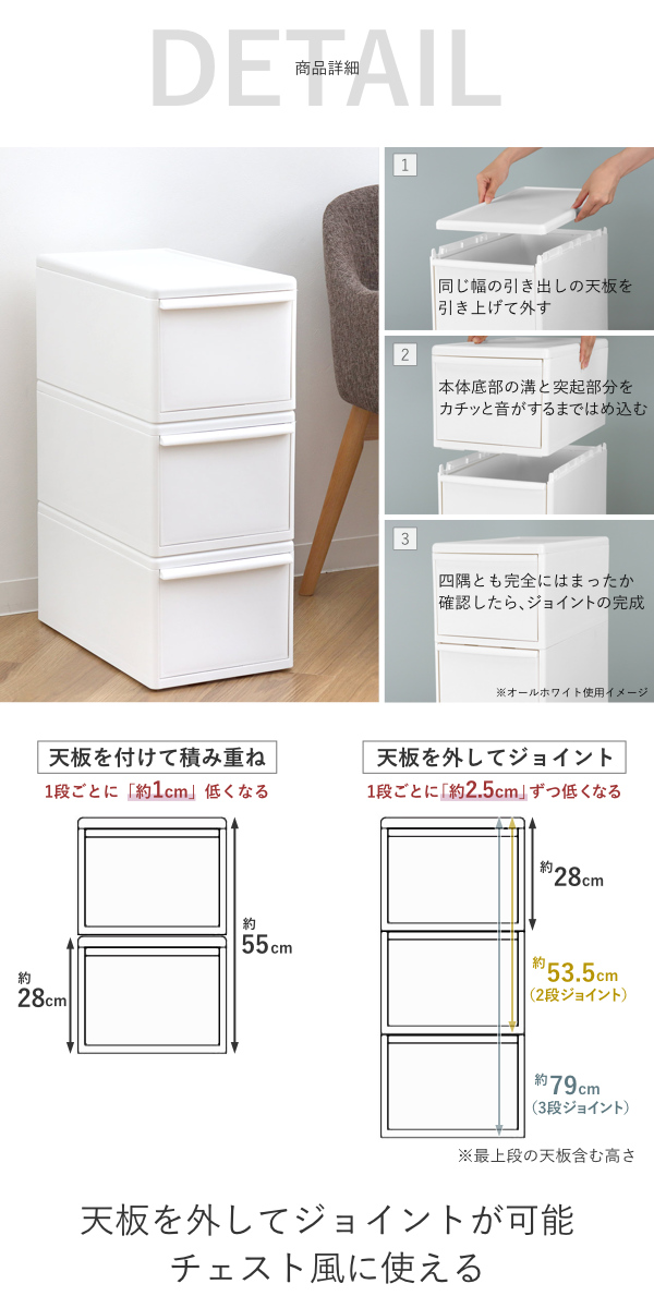 同じ幅の商品をジョイントすると、全体の高さは1段ごとに「約2.5cm」ずつ低くなります。ジョイントせずに、そのまま積み重ねることも可能で、その場合全体の高さは1段ごとに「約1cm」ずつ低くなります。
