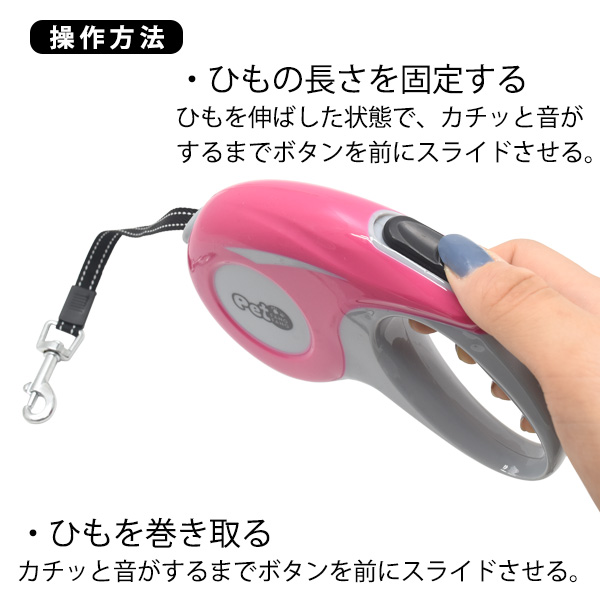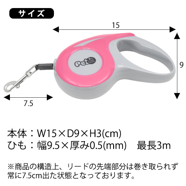 最大3mまで伸びる、ペット用リードです。ボタンひとつの簡単操作!ボタンを押すだけでリードの長さをロック、ロック解除できます。 手にフィットする握りやすいハンドルです。ビビッドピンク、ブルーの2色からお選びいただけます。※海外からの輸入商品です。多少のゆがみや汚れはご了承ください。