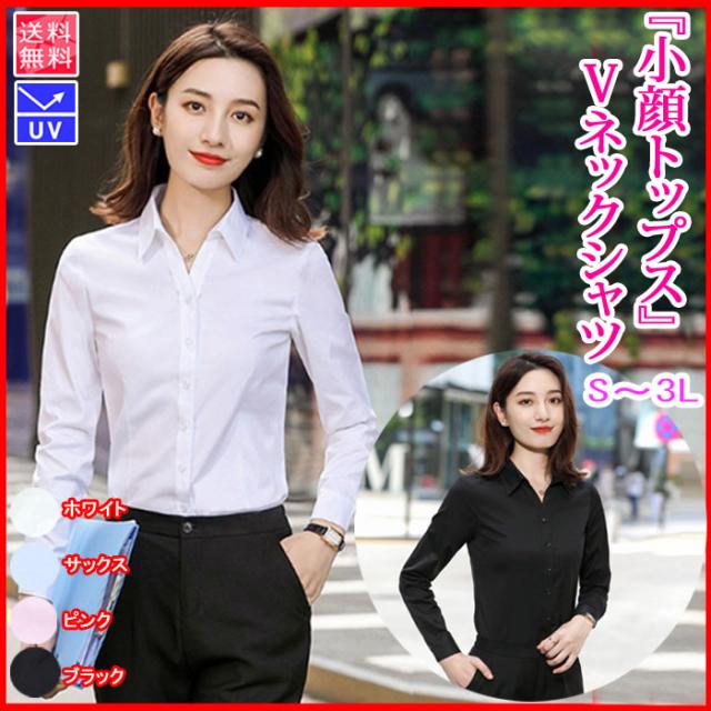ブラウス シャツ yシャツ オフィス ビジネス Vネック 長袖 半袖 制服 事務服 就活 ノーアイロン 白 黒 サックス ピンク メール便送料無料