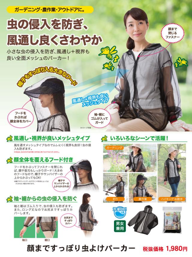 風通しの良いメッシュタイプの虫よけパーカー!・サッと着るだけで、虫よけ対策できる、メッシュパーカー。・袖口と裾部分はゴム入りで、虫の侵入も防ぎます。・ガーデニングやアウトドア、農作業など、いろんなシーンで使えます。【規格】商品サイズ仮)約D0.8×W154.0×H93.0() 個装サイズ仮)約D3.5×W16.2×H22.0+3.0() 材質:本体:ナイロン100% ゴム部:ポリエステル100% 製造国:中国