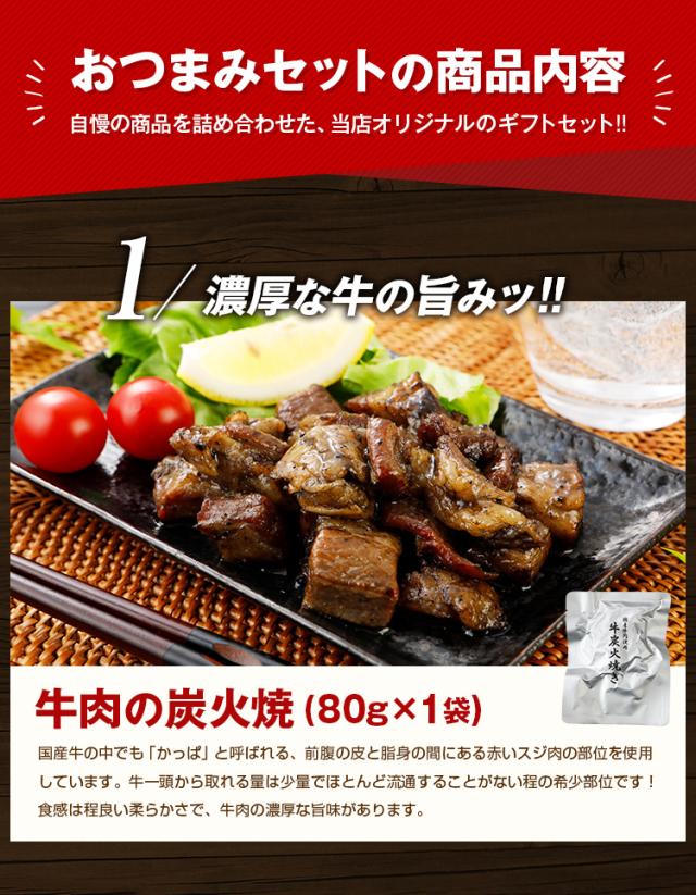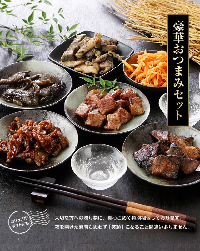 おつまみ セット 6種 グルメ ギフト プレゼント レトルト 送料無料 肉 詰め合わせ 炭火焼 牛肉 鶏肉 国産 鶏皮 さきいか 明太 常温商品 食べ物 食品 旨さに 訳あり 珍味 食べ物 お酒 ビール 日本酒 に合う 風呂敷 [宅配]