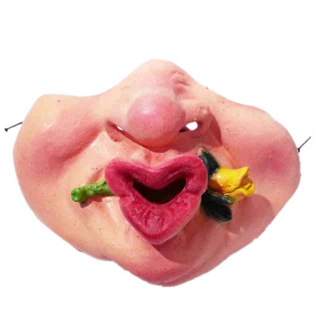 キスするのような表情で口に花を咥えた面白いユニークな変顔マスク。