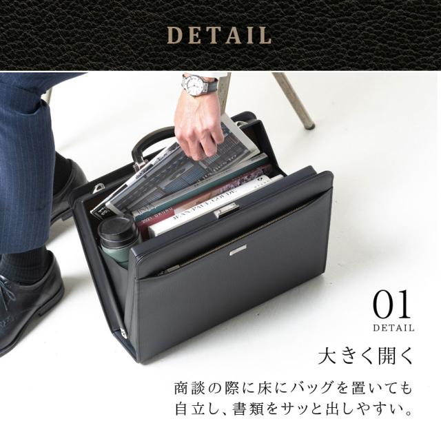 バッグが床に置いても自立し、大きく開き、出し入れしやすい開口部(大開き仕様)。仕事で必要な資料や書類がさっと取り出せ、スムーズな商談ができます。