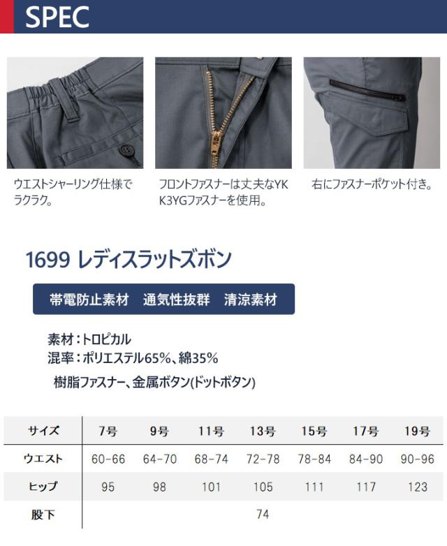 ラットズボン ジーベック 1699 レディース 通気性抜群 帯電防止 軽量 女性用 作業服 作業着 春夏 ユニフォーム 7号-19号 1694シリーズ XEBEC