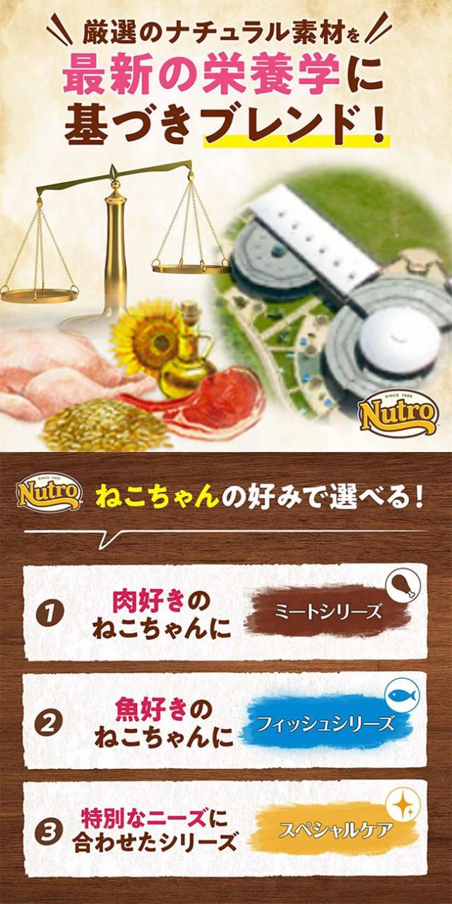 ・ニュートロ ナチュラル チョイス キャットドライフードは厳選した自然素材を使用しています。厳しい独自の検査基準を設け、原材料の品質、均一性、安全性の確保に向けて厳格な検査を行っています。世界のペット栄養学をリードするウォルサム研究所の知見を基に、猫のライフスタイルに合わせて、最適な素材、最適な栄養バランス、高い嗜好性と消化性を実現し、愛猫の健康維持をサポートします。