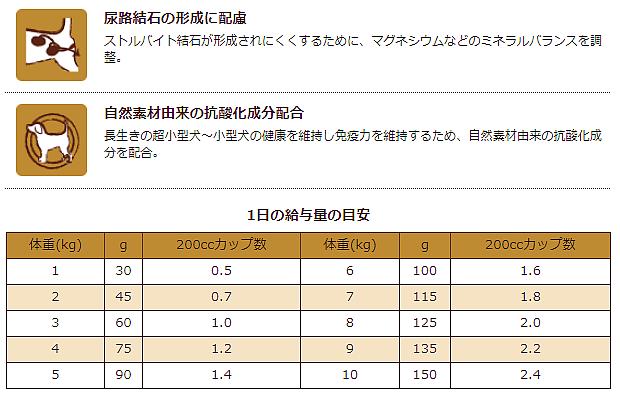| 保証分析値 | タンパク質25.0% 以上、脂質7.0% 以上、粗繊維11.5% 以下、灰分10.0% 以下、水分10.0% 以下、オメガ3脂肪酸0.1% 以上、オメガ6脂肪酸1.5% 以上、タウリン0.15% 以上、セレン0.35mg/kg 以上 |