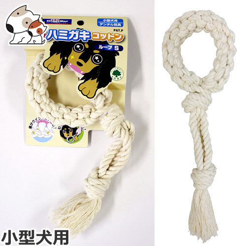 ・コットン糸のロープを編み込んだおもちゃ。くわえやすく持ちやすいループ型。編みあみロープの編み目に歯が食い込むたびに歯をみがき汚れを取る。糸をぎゅっと縒ったコットンロープ玩具とちがい、編み目にゆとりがあり歯が根元までよく食い込む。引っぱりっこ遊びもできる。