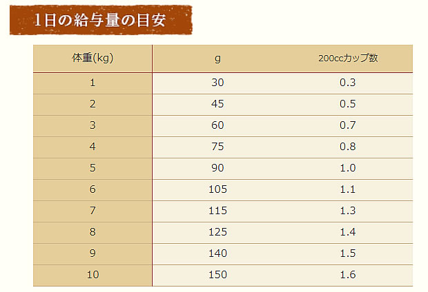 | 保証分析値 | タンパク質29.0%以上、脂質16.0%以上、粗繊維4.0%以下、灰分9.0%以下、水分10.0%以下、カルシウム1.5%以上、ビタミンE80IU/kg以上、オメガ6脂肪酸2.8%以上、オメガ3脂肪酸0.5%以上、亜鉛250mg/kg以上、リン1.0%以上 |